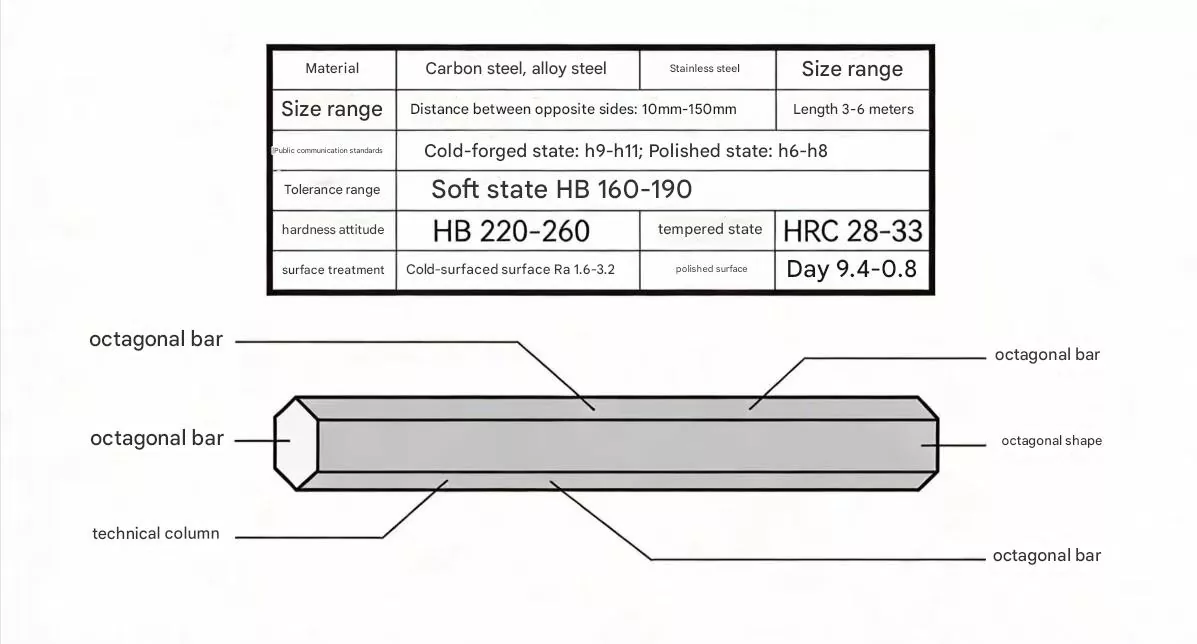 Het verschilt van standaard gewoon achthoekig staal, omdat het een op maat gemaakt massief metalen profiel is met een achthoekige doorsnede en een asymmetrische structuur, zoals platte achthoeken, excentrische achthoeken of functionele kenmerken zoals sleutelsleuven, oliesleuven en positioneringsvlakken.