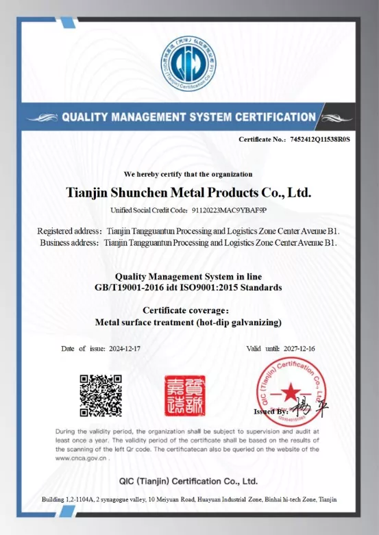 Kies Shunchen voor betrouwbare kwaliteit. We gebruiken hoogwaardig staal van Q235B of Q355B, verwerkt door middel van thermisch verzinken voor corrosiebestendigheid. De temperatuur van de zinken pot wordt nauwkeurig geregeld binnen het bereik van 450-460 graden Celsius om een sterke hechting van de zinklaag te garanderen en geen gemiste plekken te voorkomen. Onze producten voldoen aan de ISO9001-certificering van het kwaliteitssysteem en worden ondersteund door inspectierapporten van zinkcoatings van derden.